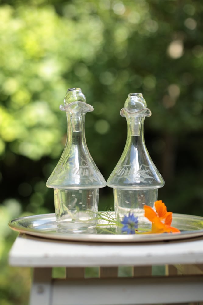 Essig und Öl Fläschen, Glas, mit dekorativem Schliff, französisch